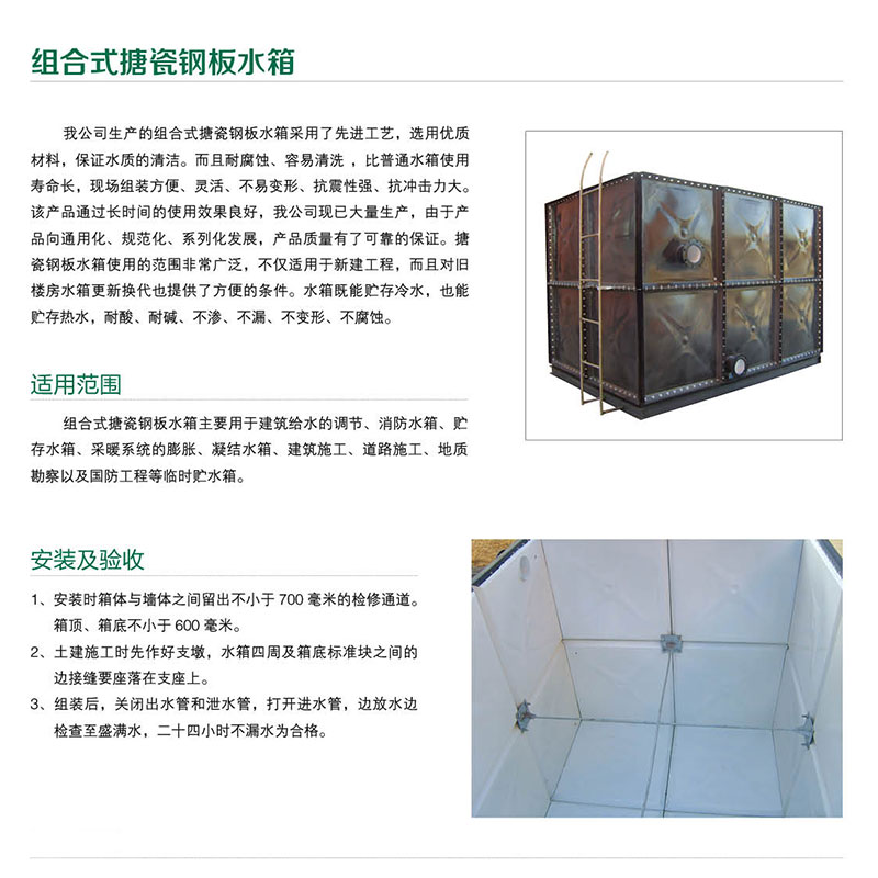 搪瓷水箱,搪瓷水箱、不銹鋼水箱、鍍鋅水箱、人防水箱等產(chǎn)品。高強搪瓷鋼板水箱是采用HSC系列瓷釉作為底釉和面釉涂搪在δ2-δ5鋼板上,板塊經(jīng)燒制后組裝而成的一種新型水箱。其瓷